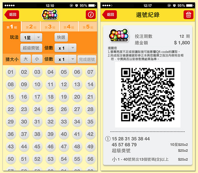 如果您的智慧型手機為iOS或Android之作業系統,您可先下載「台彩行動選號」APP,並利用 APP中的「我要選號」功能,填寫投注內容。每張電子選號單皆將產生一個QR code,至投注站掃描該QR